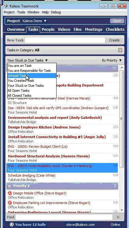 When Kalexo is opened up, an overview screen – a bit like an in-box or ‘headlines page’ – gives a quick overview of recent project activity. Clicking on the task tab then displays the status of a user’s various tasks, with priority items displayed towards the top (a toggle at the top allows users to view all or view only unread items). Configurable, it offers a choice of ways to list and view items. Filters can be set to show all tasks or only the ones that involve you or your company or team. Tasks can also be grouped by priority, status, deadline, person responsible, category, creator, date created, recent activity or tag. A search field at the bottom of the screen also helps users to find particular tasks.