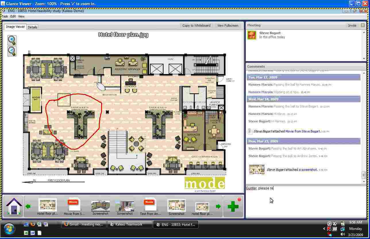 Steve Bogart, Kalexo’s VP of Business Development, used a Glance session to guide me through the functionality of the current version of TeamWork. I was also able to meet a current user, Stephen Boak of Buro Happold, in London and get some end-user feedback on the system.