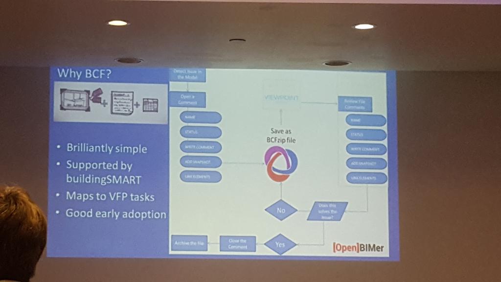 (Update: 1500 BST) – I also talked over lunch to John about the ongoing Innovate UK-funded project looking at ‘satellite’ or ‘Tier2Tier’ CDEs (post), due to finish this autumn. He told me the research project has identified different speeds of adoption of COBie within project supply chains, and also some shortcomings in processes currently defined in BIM Execution Plans (BEPs) regarding publication of data to satellite CDEs. Learning from the Tier2Tierproject will be shared by the project’s academic partners following its conclusion.