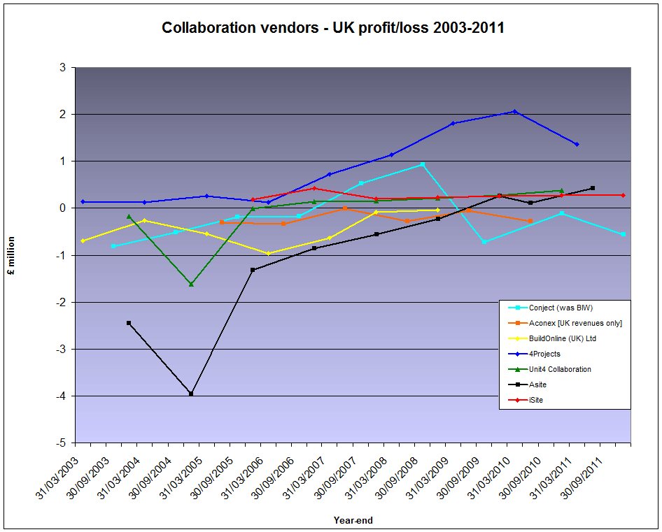 At the time of the MBO, 4Projects was valued at around 6.7 times its 2007 revenues. Factors in that valuation will have included historic revenue growth figures and positive sentiment for SaaS businesses, but the global financial crisis saw 4Projects’ growth falter for two successive years after peaking at £5.5m in 2009, the construction industry’s recovery has been patchy and pre-recession SaaS enthusiasm may well have dissipated a bit. However, 4Projects’ CFO Chris Baty recently told me about the the company’s accelerating double-digit growth and prospects of a record-breaking year to March 2013, which could put the revenues at, say, £6m. Being optimistic, in the (unlikely) event a similar multiple was applied to this deal, we could therefore be talking of a transaction worth some £40m; being realistic, I suspect the valuation to be somewhat lower, perhaps around £30-£33m.